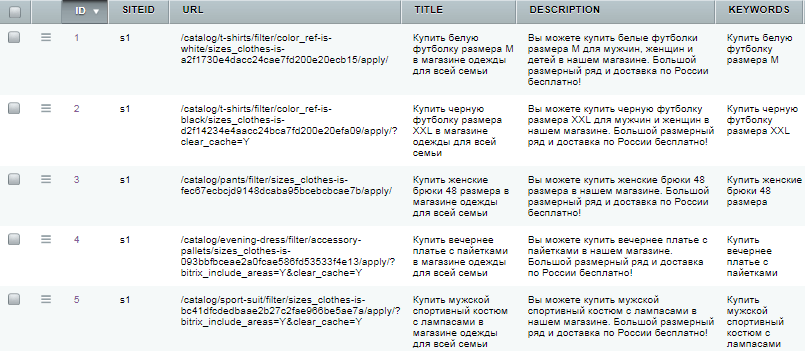Особенно удобен этот инструмент при работе с тегированием на страницах «умного фильтра». Для каждой позиции фильтрации можно выставить свои значения.